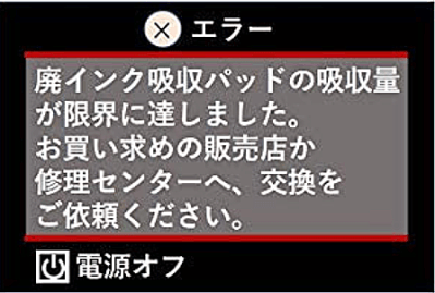 『廃インクの吸収パッドの吸収量が限界に達しました・・・』のエラーメッセージとともに、プリンターが使えなくなりました。
